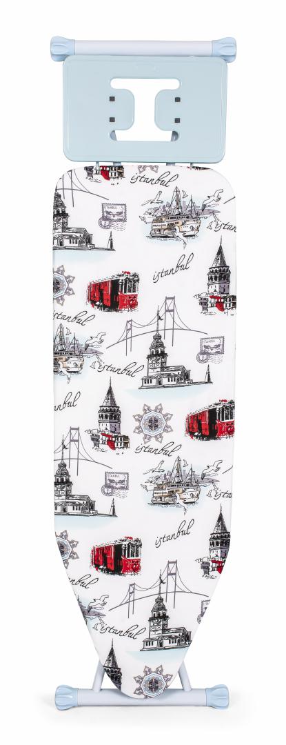 Blat : plasa, husa bumbac + protectie pasla ; Picioare: Teava cu D : 21 mm – 38 mm , grosime :0.6 mm; Culoare : Alb + turcuaz; Vopsire in camp electrostatic cu protectie anticoroziva