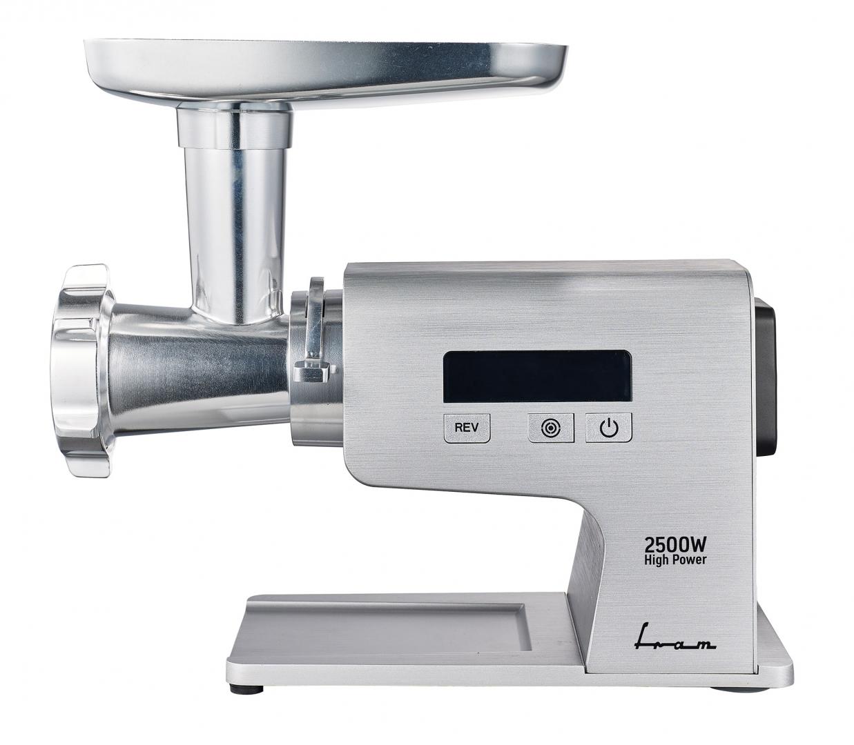 Masina de tocat Fram FMG-MDT2500X, putere maxima: 2500W, angrenaj metalic , accesoriu rosii , motor DC, display LCD, cutit inox , 2 site din inox, accesorii pentru carnati si kibbe , carcasa aluminiu turnat