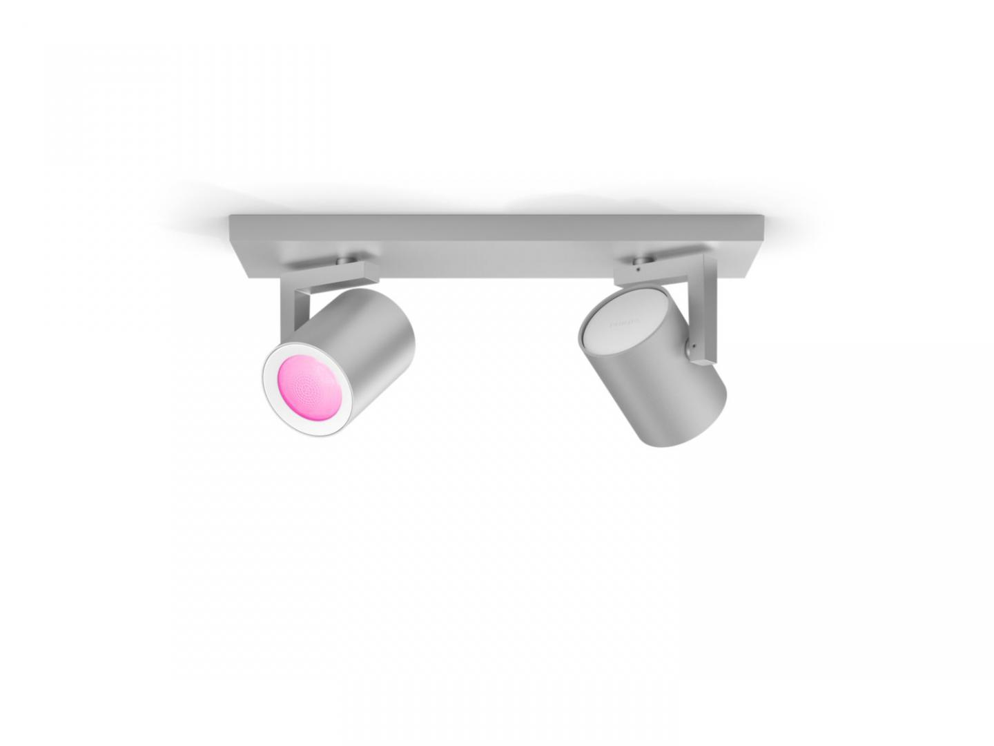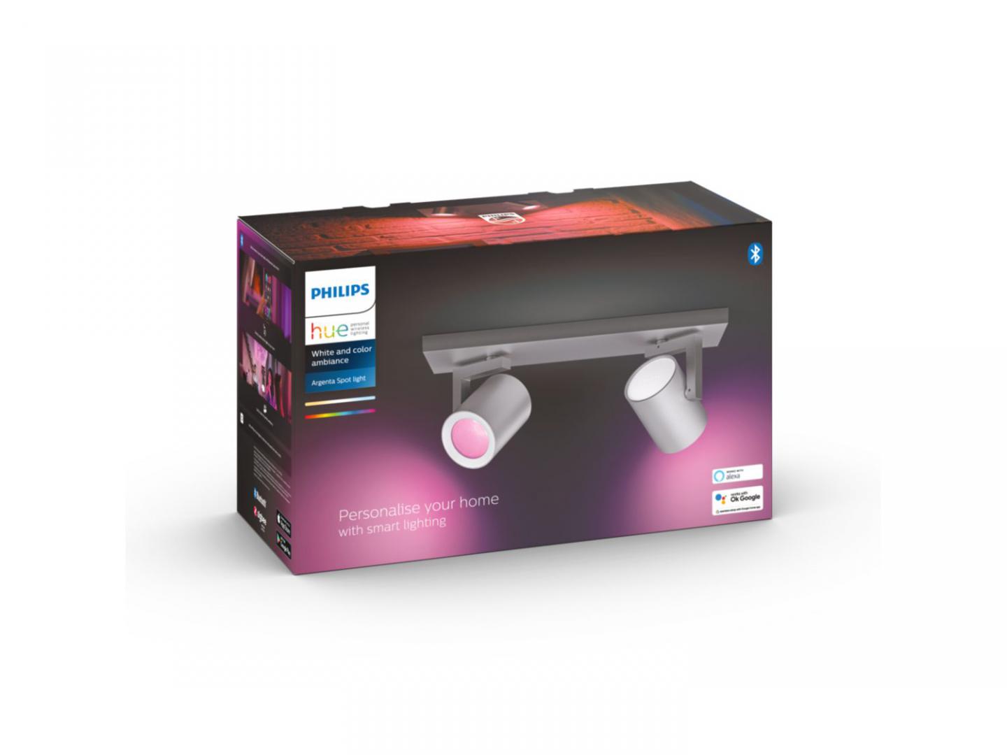 Spot LED RGB Dublu Philips Hue Argenta, Bluetooth, 2xGU10, 2×5.7W, 2×350 lm, lumina alba si color (2000-6500K), IP20, Metal, Argintiu