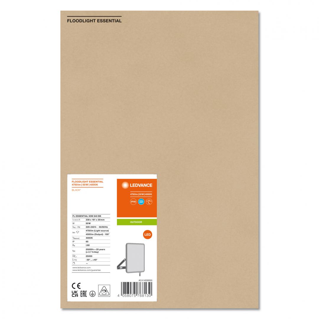 Proiector LED Ledvance FLOODLIGHT ESSENTIAL, 50W, 220-240V, 4500 lm, lumina neutra (4000K), IP65, 23.8x3x16.1cm, aluminiu, Negru