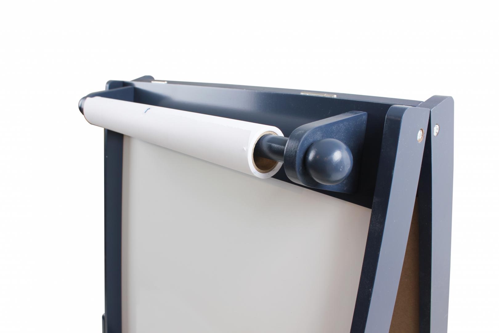 Tabla are doua fete: o fata alba pentru desen, cu rola de hartie inclusa si una neagra pentru desen sau pentru scriere cu creta;
