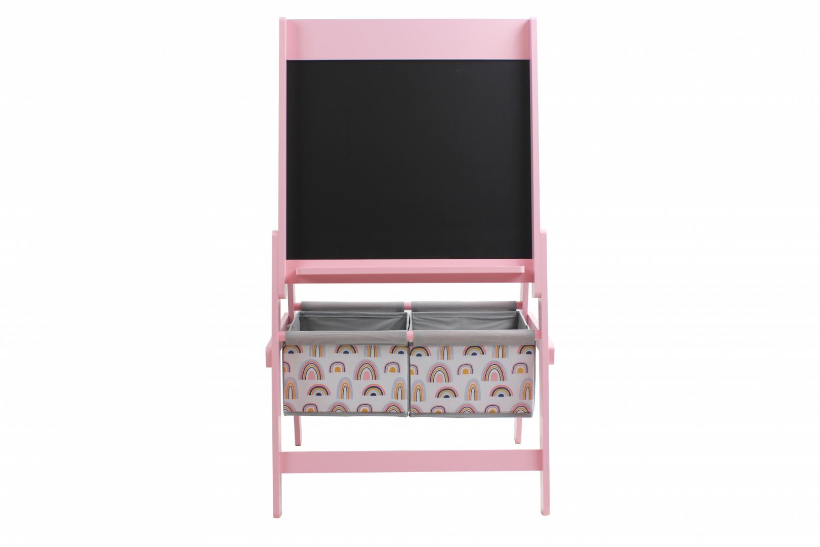 Tabla are doua fete: o fata alba pentru desen, cu rola de hartie inclusa si una neagra pentru desen sau pentru scriere cu creta;