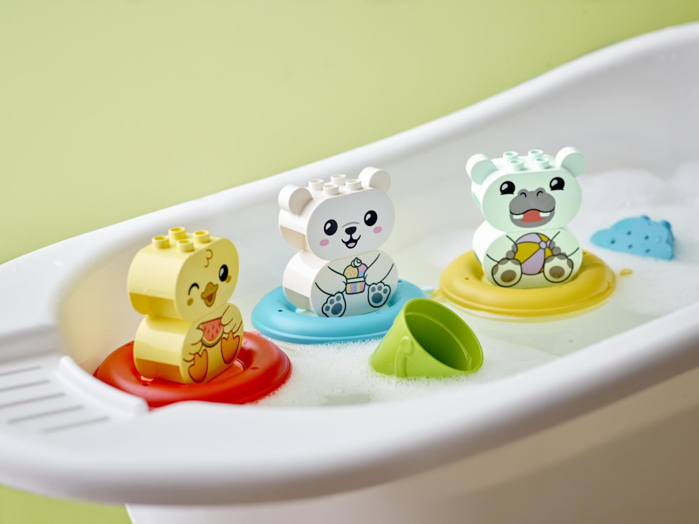 | Adu distracția cu animale în baia copilașului tău, cu hipopotamul, rața și ursul polar simpatic. Cele 3 animale se pot așeza în inele plutitoare, atașabile, de culori diferite. Există o găleată pentru a spăla animalele și un nor care aduce ploaia. Inelele se pot desface pentru a fi curățate cu ușurință, așa că această jucărie adaptabilă pentru dezvoltare este ușor de curățat și igienizat, la fiecare baie. Distracție plutitoare cu jucării animale de baie ușor de curățat LEGO® DUPLO® Prima mea distracție la baie: Tren cu animale plutitoare (10965) este o jucărie de baie pentru dezvoltare ușor de curățat, pentru preșcolari de 18 luni și mai mari. Jucărie plutitoare de baie ușor de curățatOferă-i copilașului tău distracție la baie cu hipopotamul, rața și ursul polar simpatic. Cele 3 animale pot fi așezate în inele plutitoare, atașabile, de culori diferite. Există o găleată pentru a spăla animalele și un nor care face ploaie. Cârligele rotunjite permit copiilor să conecteze și să desprindă inelele. Cârligele rotunjite de pe inelele plutitoare permit copiilor să le conecteze la inelele din seturile Distracție la baie: Panda roșu plutitor 10964 și Distracție la baie: Insula animalelor plutitoare 10966 (seturile se vând separat). Și deoarece fiecare inel se poate desface pentru a fi clătit cu ușurință, este ușor de curățat și igienizat, la fiecare baie. Învățare ludică pentru copii miciPărinții pot împărtăși etapele prețioase de dezvoltare deoarece jucăriile LEGO DUPLO pun distracția cu final deschis, exprimarea de sine și explorarea veselă în mâinile copiilor mici. |