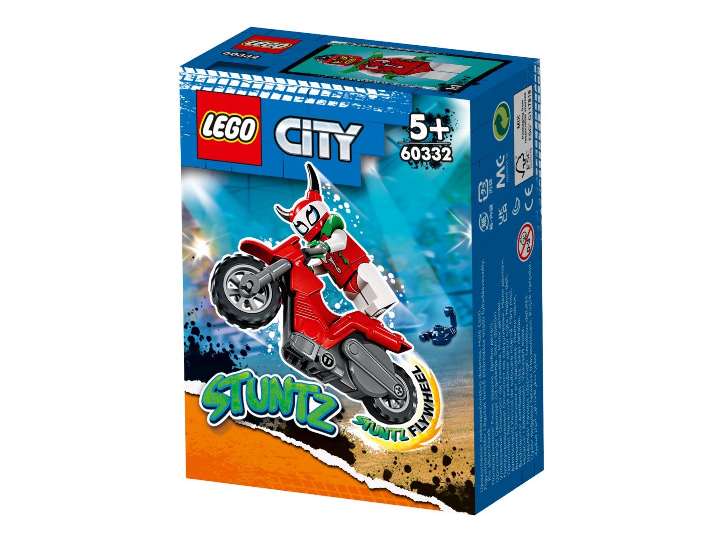 Pornește motocicleta de cascadorii acționată de volant și pregătește-te de acțiune veritabilă pe 2 roți cu echipa LEGO® City Stuntz! Vino alături de Scorpion Luchadora, expertă în cascadorii LEGO City și pasionată de lupte corp la corp, pentru cascadorii uimitoare cu mascota ei scorpion. Zboară de pe rampe pentru manevre formidabile la înălțime și aterizări cool! Ține-te bine… această motociclistă neînfricată cu coarne este neîndurătoare!