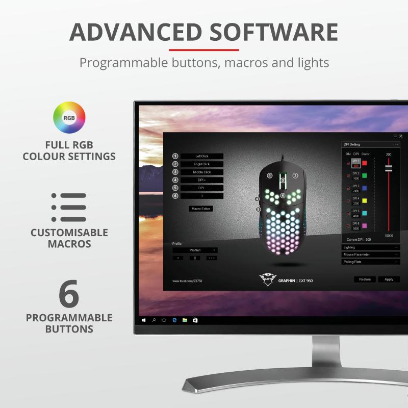Mouse cu fir Trust GXT 960 Graphin Ultra-lightweight Gaming Mouse Specifications General Height of main product (in mm) 40 mm Width of main product (in mm) 63 mm Depth of main product (in mm) 126 mm Total weight 106 g Weight of main unit 74 g Formfactor standard Ergonomic design no Connectivity Connection type wired Bluetooth no USB version 2.0 Connector type USB-A male Features Silent click no Gliding pads teflon Software yes DPI adjustable yes Gaming Designed for gaming yes Lighting Lights yes Input Power source USB Sensor DPI range 200 dpi – 10000 dpi Max. DPI 10000 dpi Sensor technology optical Compatibility Compatible Software Platforms Windows Compatible Device Types laptop, pc Control Grip type palm, finger, claw Horizontal scrolling no Controls left, right, mid, dpi loop, forward, backward Number of buttons 6 DPI button yes Programmable buttons yes Adjustable weight no Suitable surface non-reflective flat surface Left-right handed use right-handed Scroll wheel yes Trackball no