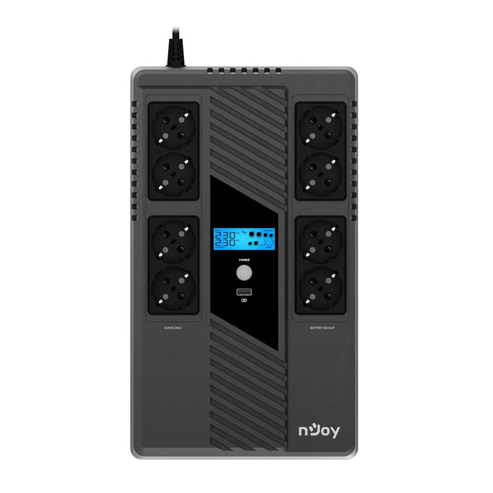 UPS nJoy Token 800 VA / 480 W Capacity 800 VA / 480 W Type Line-Interactive Input Nominal Voltage 230 VAC Accepted Voltage Range 170 – 280 VAC Frequency Range 50Hz / 60Hz (Auto Sensing) Output Nominal Voltage 230 VAC Accepted Voltage range 230 VAC, +/- 10% Frequency Range (Batt. Mode) 50 Hz / 60Hz ± 1% Power Factor 0.6 @ nominal voltage (100% load) Waveform (Batt. Mode) Simulated Sinewave Transfer Time 6ms typical Indicators type LCD Standby mode, AC mode Overload mode, Battery mode Self-Test mode Battery replacement mode Fault Mode Alarm Battery mode, Overload mode, Low battery, Fault mode Protection Outlets type 4x Schuko Battery Backup 4x Schuko Surge Protection RJ45 protection with 1Gb/s Full protection Overload, discharge, and overcharge protection Environement Noise level Fanless Humidity 0-90 % (non-condensing) Temperature 0-40ºC Battery Battery Type & Number 1x GP09122F (PN: BTVACIUOCTA2FCN01B) Typical Recharge Time 6~8 hours recover to 90% capacity Running time on battery (minutes) 25% Load – 15min 50% Load – 2min 30s 75% Load – 0min 48s Management Communication port HID USB Software https://www.power-softwaredownload. com/viewpower.html USB Charger 5V/2.1A Physical Product dimensions 345 x 200 x 100 mm Product weight 5.8 kg Retail pack dimensions 425 x 146 x 269 mm Retail pack Weight 6.2 kg