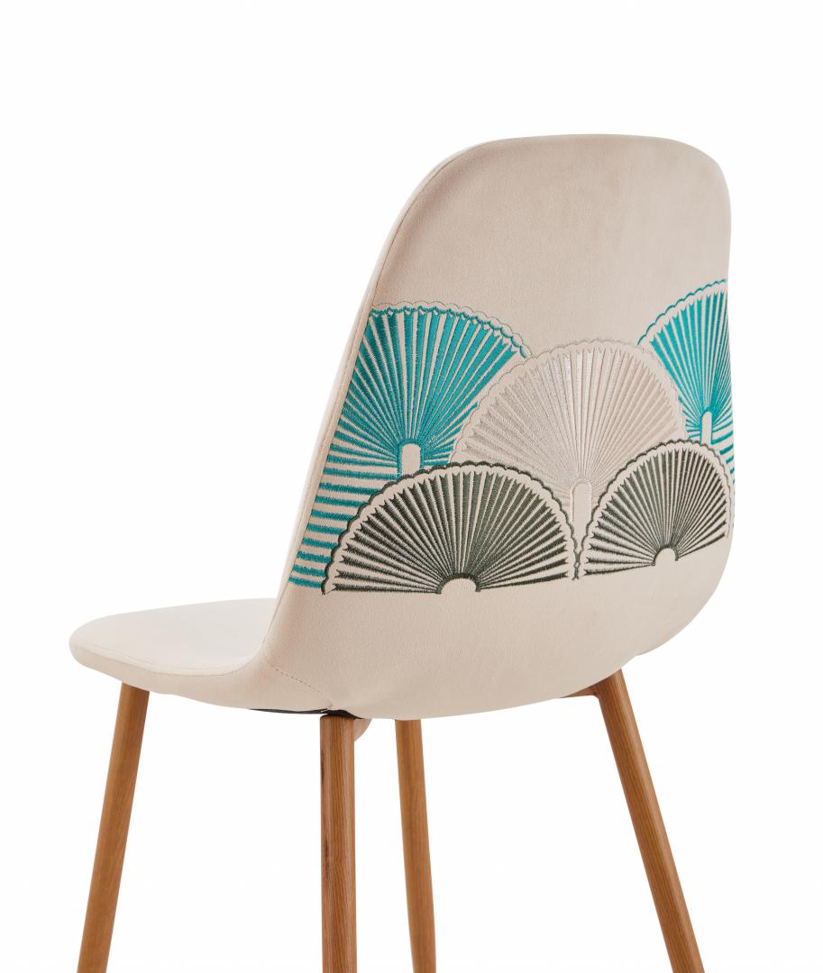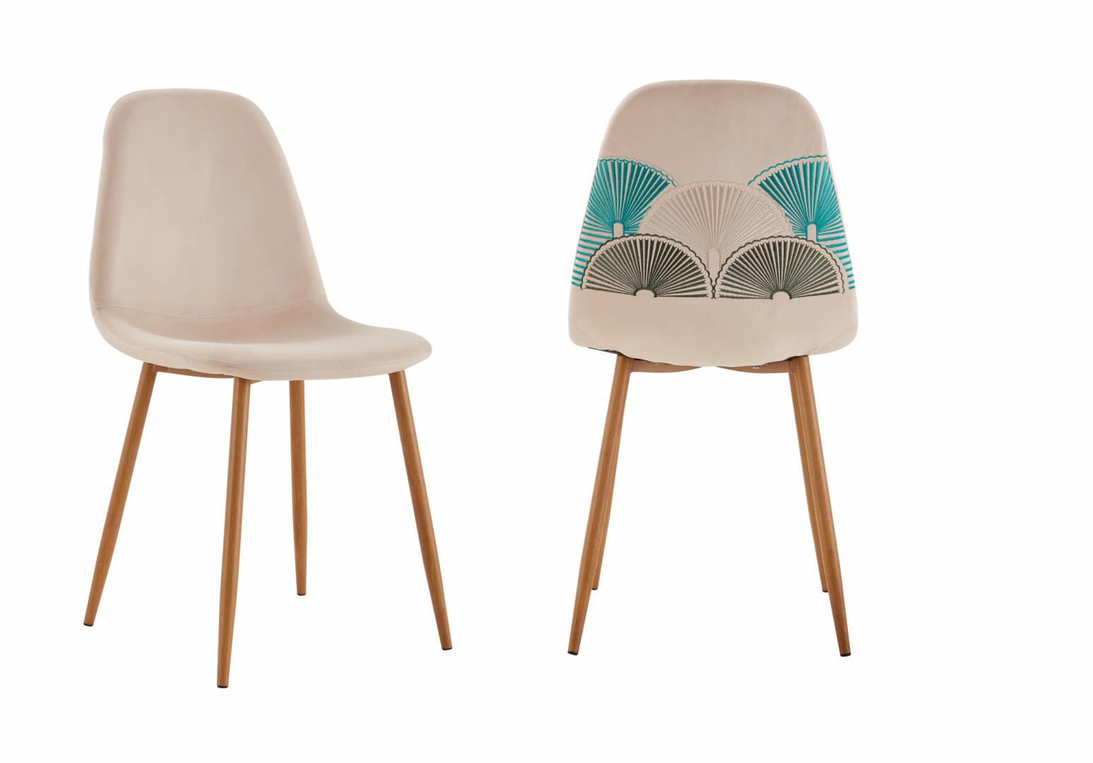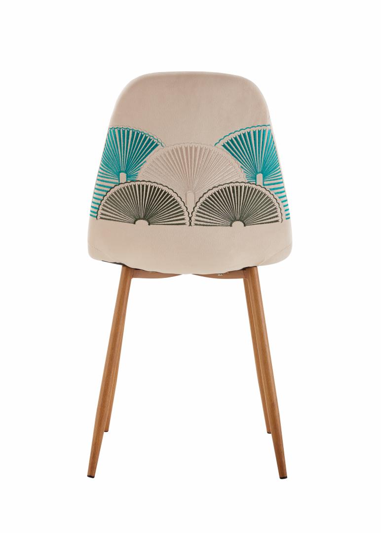 Material : picioare din metal cu aspect de lemn, sezut din plastic imbracat in tapiterie din catifea cu model brodat pe spate. Umplutura din spuma
