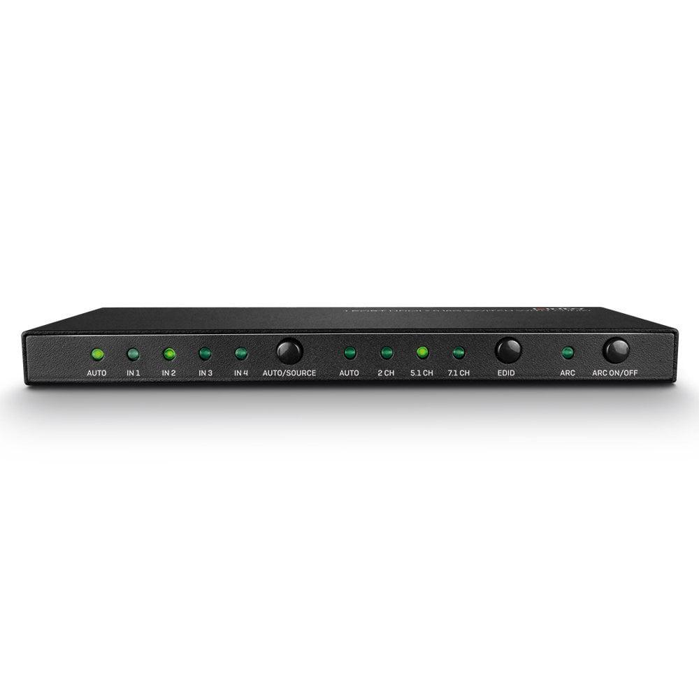 Lindy 4 Port HDMI 18G Switch with Audio Technical details Specifications AV Interface: HDMI Interface Standard: HDMI 2.0 Supports Bandwidth: 18Gbps Maximum Resolution: 3840×2160@60Hz 4:4:4 8bit HDCP Support: 2.2 Supported Audio: Audio Pass-through, Analogue 2CH, Up to 5.1CH (Optical) Separate Audio Ports: Stereo (3.5mm) Toslink (Optical) (with included adapter) IR Support: 38kHz CEC Support: Pass-through Serial Interface: RS232 (3.5mm) Special Features: Audio EDID Management Automatic switching of active ports Connectors Input: 4 x HDMI Type A (Female) Output: HDMI Type A (Female), 3.5mm (Female) Control: RS232 (3.5mm), IR (3.5mm) Power: 5.5/2.1mm DC Socket Physical Properties Dimensions (approx.) WxDxH: 180x85x11.6mm (7.09×3.35×0.46in) Housing Material: Metal Net Weight: 0.563kg (1.24lb) Operating Temperature: 0°C – 40°C (32°F – 104°F) Storage Temperature: -20°C – 60°C (-4°F – 140°F) Humidity: 20-90% RH (non-condensing) Power Requirements: 5VDC 1A Colour: Black Miscellaneous Packaging Type: Carton Box Packaging Dimensions: 248x55x183mm (9.76×2.17×7.2in) Gross Weight: 0.682kg (1.5lb) Warranty (Years): 2 Certificated: CE. FCC, RoHS & REACH Package Contents 4 Port HDMI Switch with Audio Multi-country Power Supply (UK, EU, US & AUS) IR Extension Cable, 1.5m Mini Optical to Optical Adapter Remote Control and CR2032L Battery 3.5mm RS232 Cable, 1m Lindy Manual https://www.lindy-international.com/4-Port-HDMI-18G-Switch-with- Audio.htm?websale8=ld0101.ld021102&pi=38249