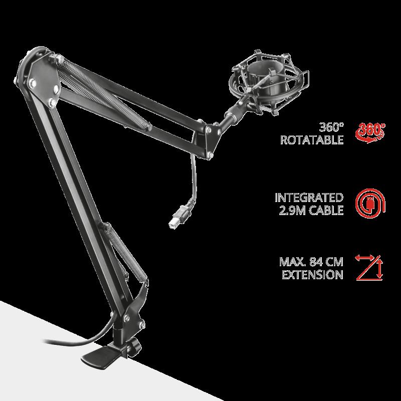 Brat Microfon Trust GXT 253 Emita Streaming Microphone Arm Specifications General Application Desktop Height of main product (in mm) 417 mm Width of main product (in mm) 114 mm Depth of main product (in mm) 39 mm Total weight 588 g Connectivity Connector type USB Features Noise reduction no Mount Type of anti-vibration measures shock mount Type of stand table arm clamp Compatibility Compatible Consoles no General compatibility Fits all commonly used microphones (5/8″ screw adapter included) https://www.trust.com/en/product/22563-gxt-253-emita-streaming- microphone-arm