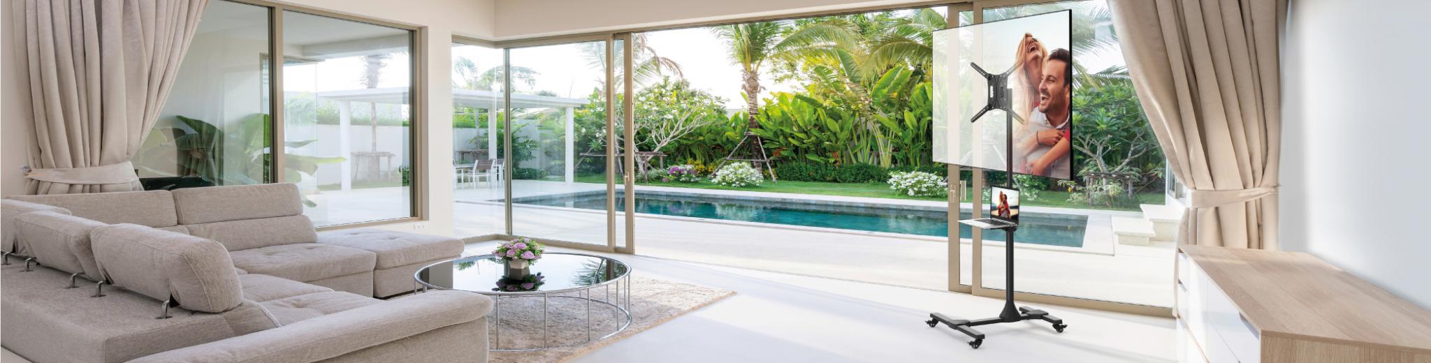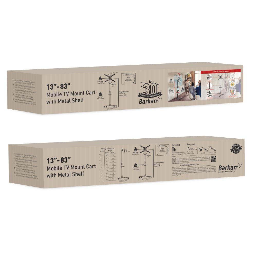 Suport Mobil de podea pentru TV plat/curbat Barkan + raft metal pentru laptop, 32″ – 83″, VESA 600x400mm, Max 150kg, Negru