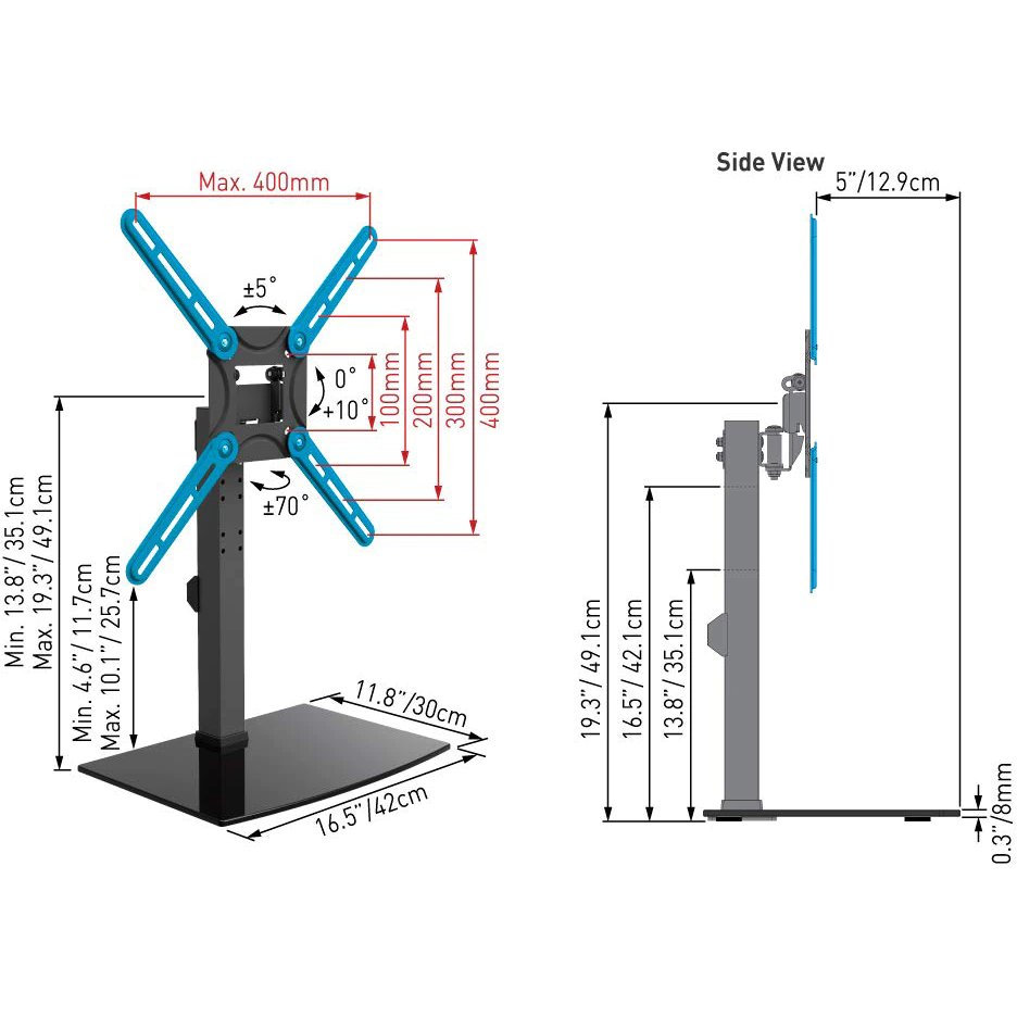- Se potriveste televizoarelor cu modele VESA (gauri de montare pe suport) 75×75, 100×100, 100×200, 200×100, 200×200, 300×300, 300×400, 400×200, 400×300, 400×400 mm si non VESA pana la 400×400 mm.