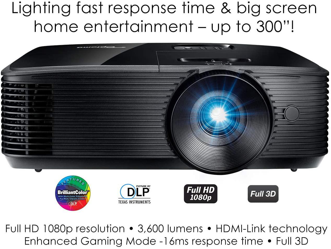 Proiector OPTOMA HD146X, DLP, FHD 1920×1080, up to WUXGA (1920×1200), 3600 lumeni, 25.000:1, 16:9 nativ, 4:3/ 16:10 compatibil, dimensiune maxim imagine 301″, distanta maxima de proiectie 9.8 m, lampa 4000 ore/ 15.000 ore dynamic, HDMI, Audio Out 3.5mm, USB-A, Kensington lock, security bar, protejare cu parola, boxa 3W, telecomanda cu baterii incluse, greutate 2.87 kg, montare pe tavan+ masa, culoare negru